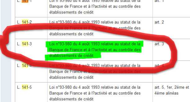 Voici la table des concordances de la loi qui indique clairement que c’est bien la loi 93-980 des socialistes qui est à l’origine de l’article 141-3 du Code Monétaire et Financier :