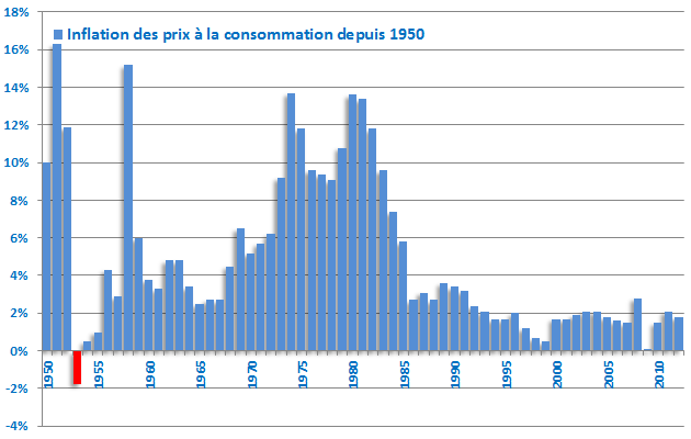 En fait, outre que la loi de 73 n’interdisait pas d’emprunter à la Banque de France, elle le permettait donc expressément mais, de surcroît, les présidents Pompidou, Valéry Giscard d’Estaing et Mitterrand à sa suite l’ont fait. Tant et si bien que sur une quinzaine d’années, du début des années 70 à 1986, année de la première cohabitation, la France a connu une inflation moyenne de 10%, atteignant même une année 14%, dévaluant sur cette période le franc de plus de 80%.